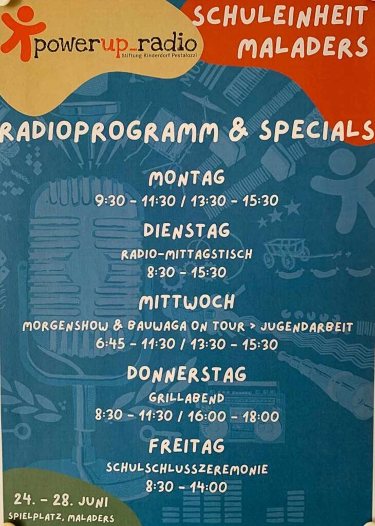 Ein unvergessliches Erlebnis für Produzierende und Zuhörerschaft. Nicht nur wegen den vielfältigen Beiträgen, die von Mut, Kreativität und Freude nur so sprühten. Das von Eltern gestaltete Radiocafé auf dem neu eröffneten Spielplatz und die gemeinsamen Mahlzeiten schafften Raum für Begegnungen.